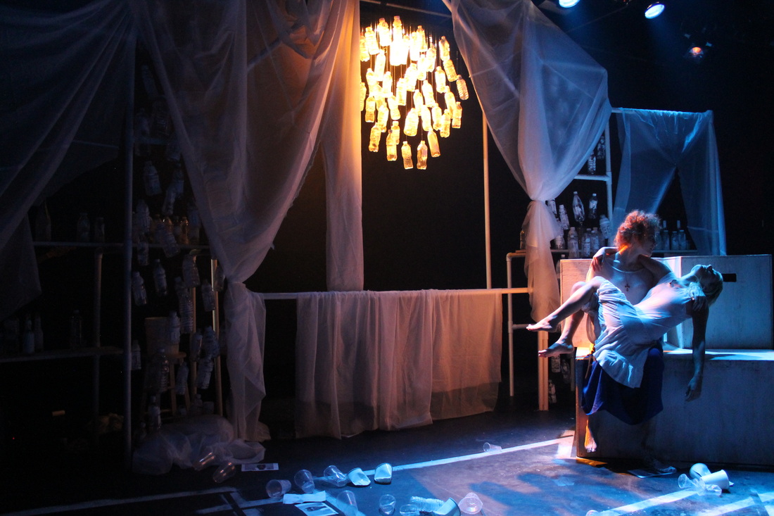 Just as in the 1911 play The Miracle which this play is based on, The Miracle Play has a Catholic foundation, but from there Jacobson’s play really departs as a broader meditation on religion. For this reason, an “invisible” cathedral became my centerpiece, no longer as corporeal but seemingly no less influential. It is known only by a wall of scaffolding that served as the apse, altar, and chapels. Sand and water had an inverse relationship throughout the play, and were used as a meditative clay—transported and poured from all kinds of bottles that you may find wash up in a city through ritualistic, ethereal movement work.