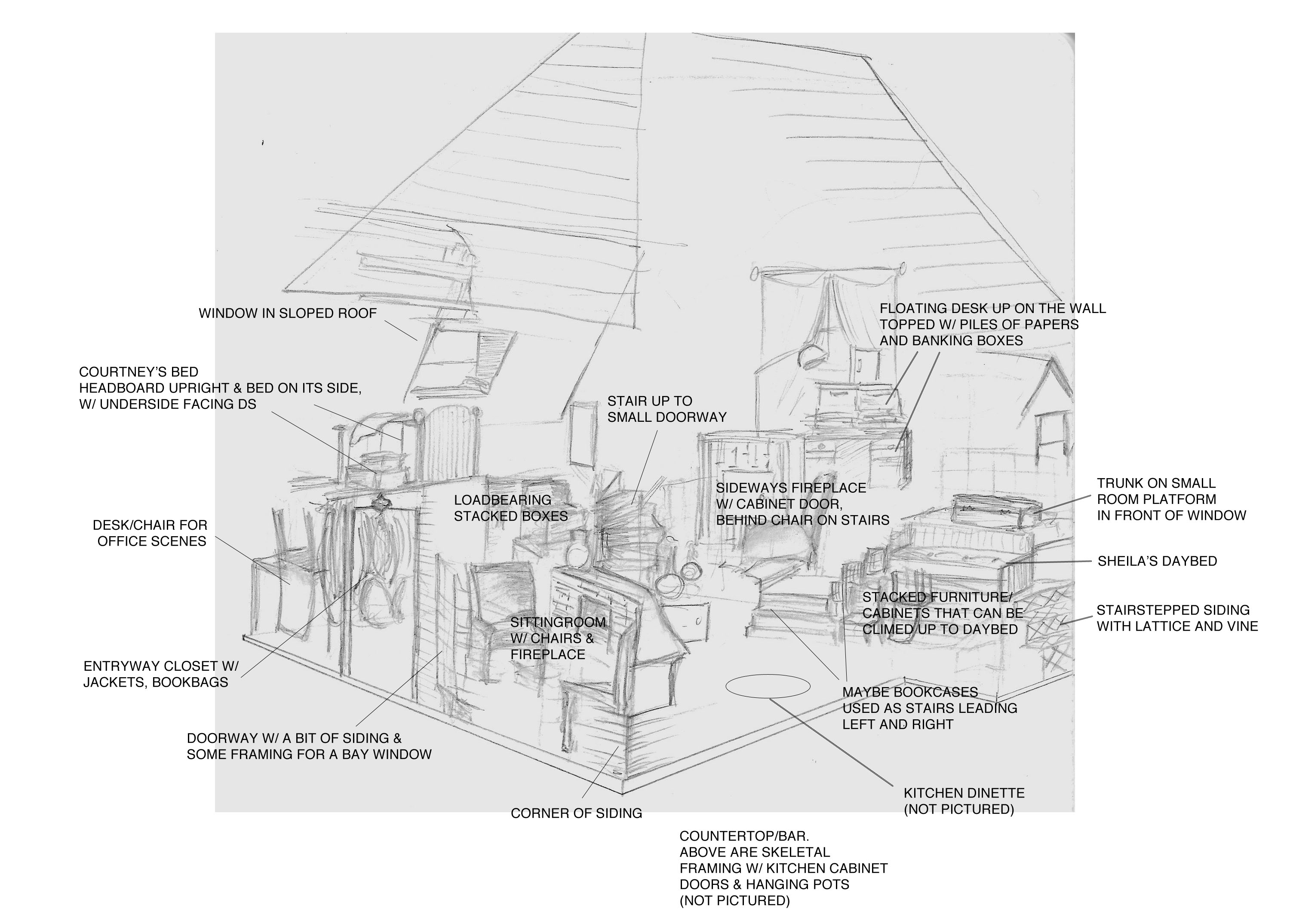 As Sheila returns to her childhood house and must unpack all her memories and personalities throughout the play, she is confronted by her new neighbor, Courtney, a representation of her younger self. I embodied this duality by smashing the two neighboring houses together into one, and designed an abstracted, encapsulated idea of “home”—a paradoxical funhouse expression of Sheila’s inner conflict that embraced AND instead of OR.