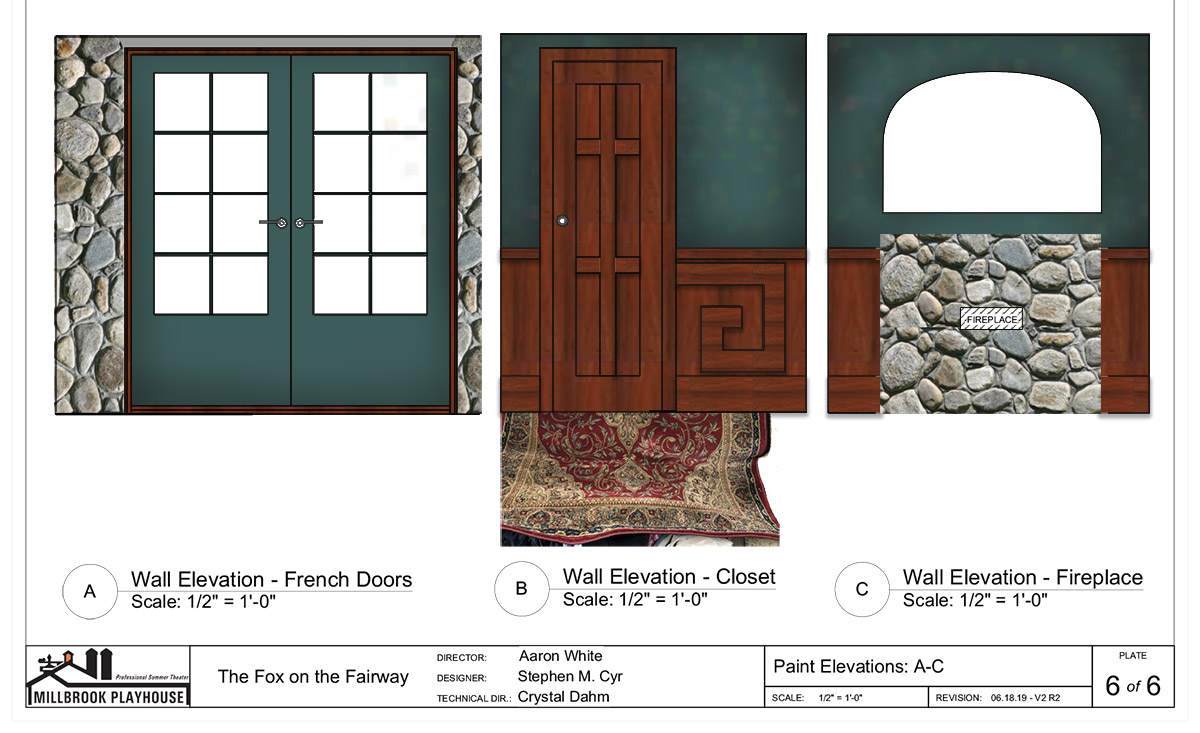 Often a play, and a director, call for realism, to which I oblige. There was still much I could influence, and I wanted to set up the right pretense for this farce. While the play takes place in what could be described as not the richest of club houses, there was something louche about the characters it represented, even in a dated, desperate way. I alluded to the dynamism in bold, specific strokes. While staying away from an abundance of competing naturalistic textures or opulence, I kept the design simple and wanting. I instead focused on the main elements of wood, stone, and my “brand” color, amping their vibrancy and dimension, matching the energy of the characters.