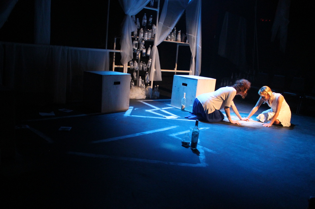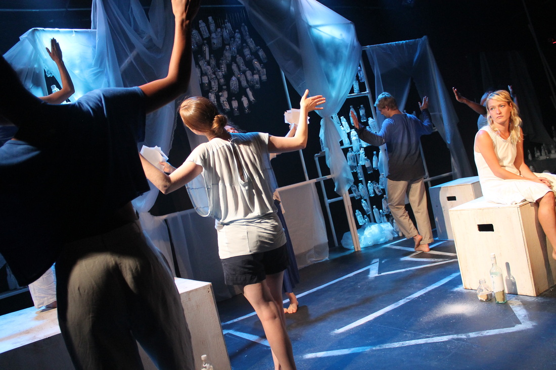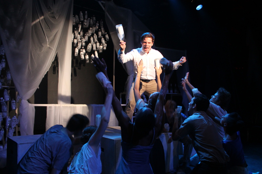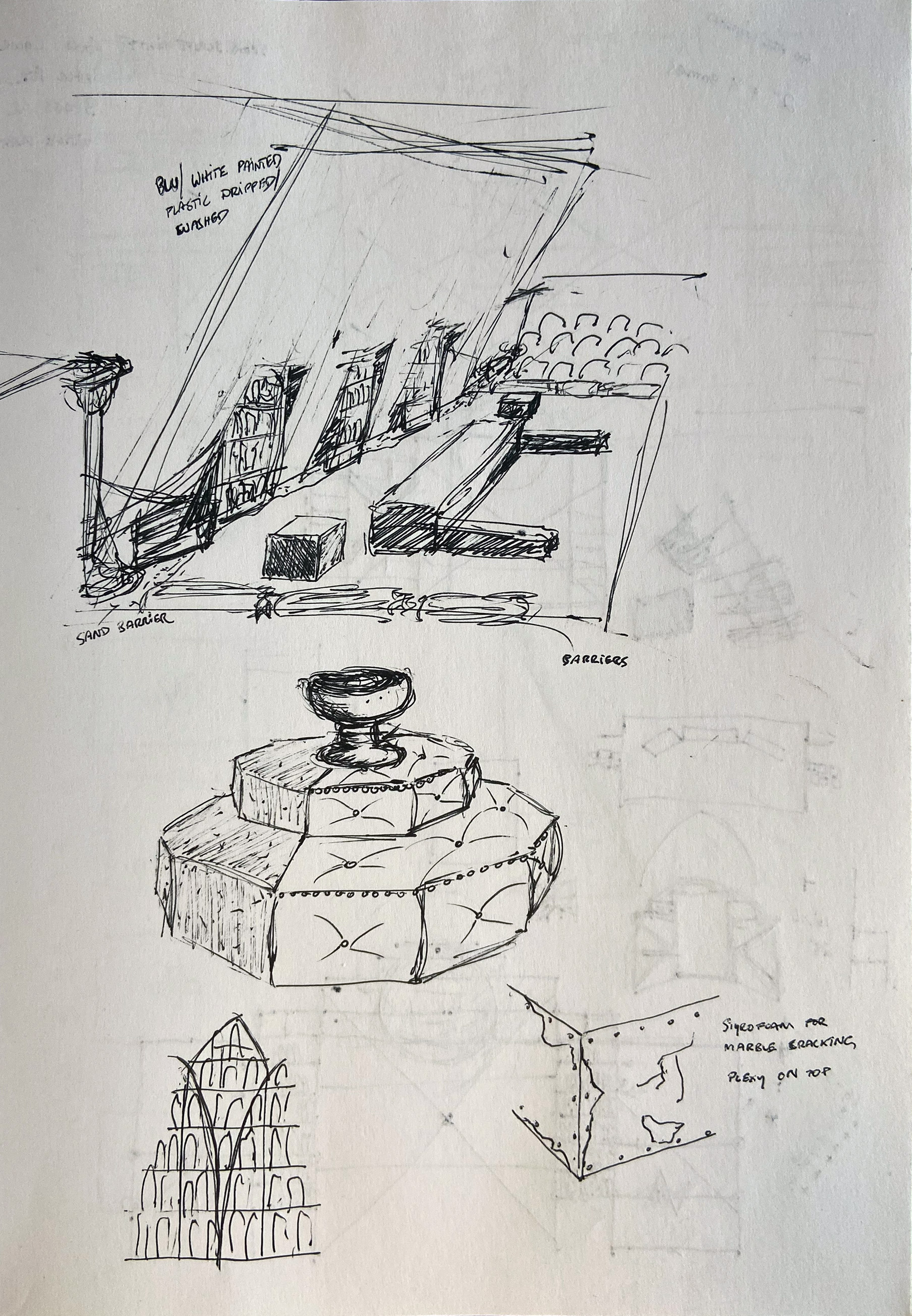 Just as in the 1911 play The Miracle which this play is based on, The Miracle Play has a Catholic foundation, but from there Jacobson’s play really departs as a broader meditation on religion. For this reason, an “invisible” cathedral became my centerpiece, no longer as corporeal but seemingly no less influential. It is known only by a wall of scaffolding that served as the apse, altar, and chapels. Sand and water had an inverse relationship throughout the play, and were used as a meditative clay—transported and poured from all kinds of bottles that you may find wash up in a city through ritualistic, ethereal movement work.