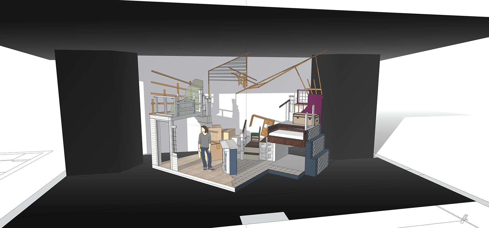 As Sheila returns to her childhood house and must unpack all her memories and personalities throughout the play, she is confronted by her new neighbor, Courtney, a representation of her younger self. I embodied this duality by smashing the two neighboring houses together into one, and designed an abstracted, encapsulated idea of “home”—a paradoxical funhouse expression of Sheila’s inner conflict that embraced AND instead of OR.